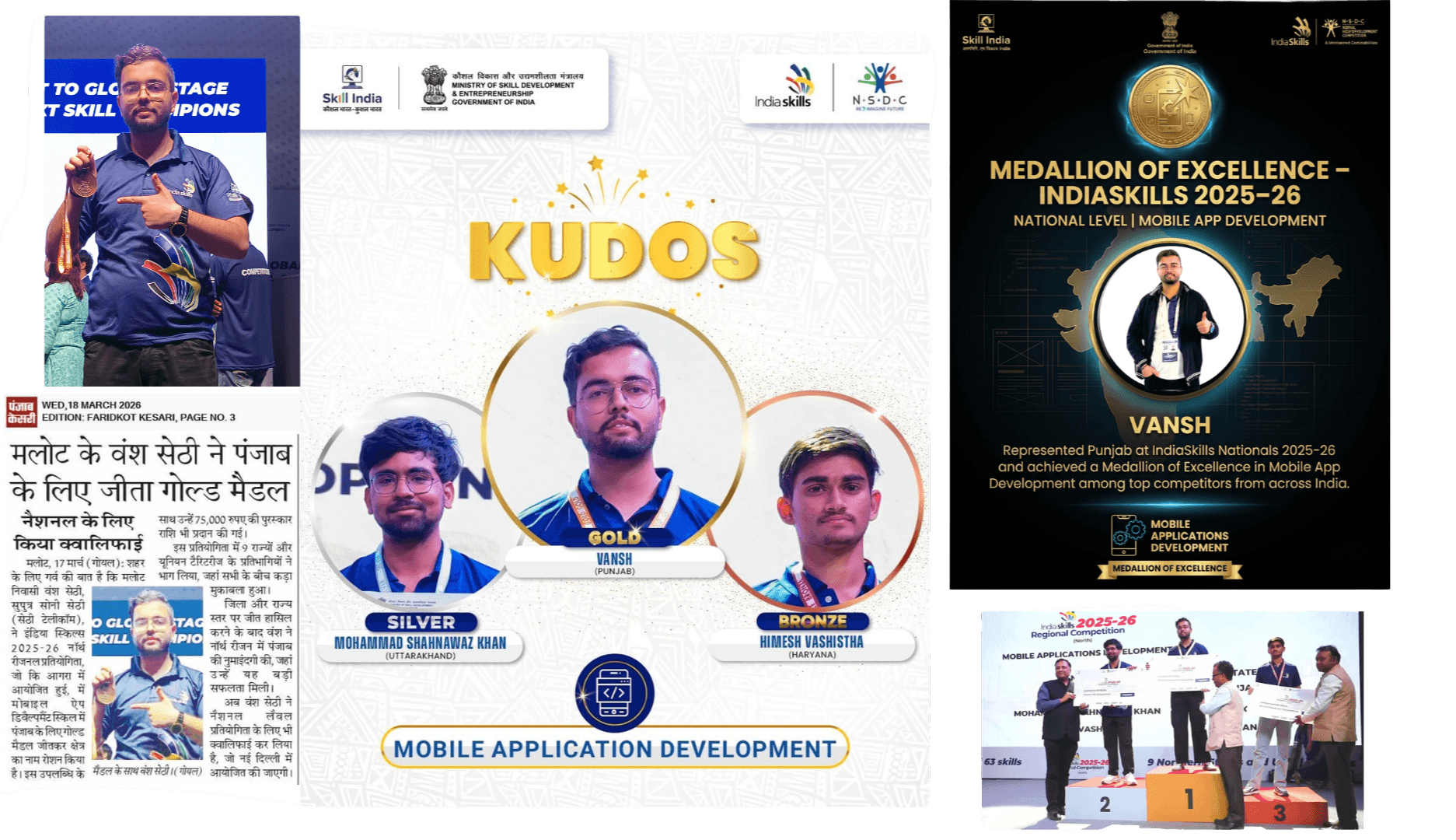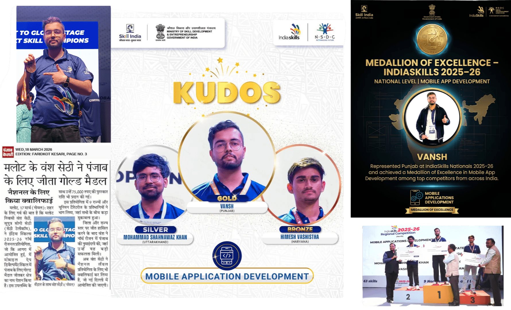 Represented Punjab at IndiaSkills 2025–26, winning a Gold Medal at the North Regionals (Agra) with a cash prize, and subsequently earned the Medallion for Excellence at the IndiaSkills 2025–26 Nationals (Noida), securing 4th position nationwide.